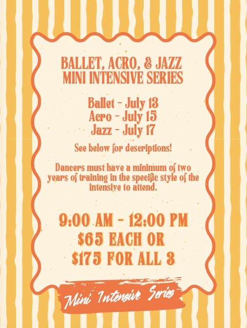 Designed to build strength, control, and confidence in acrobatic skills. Dancers will focus on strength training, flexibility, balance, and coordination to safely develop and refine acro technique. Classes will include drills and progressions that support foundational skills as well as more advanced tricks. Dancers will also explore how acrobatics is used in professional settings such as dance, circus arts, and performance, giving them a deeper understanding of the role acro plays in the performing arts.