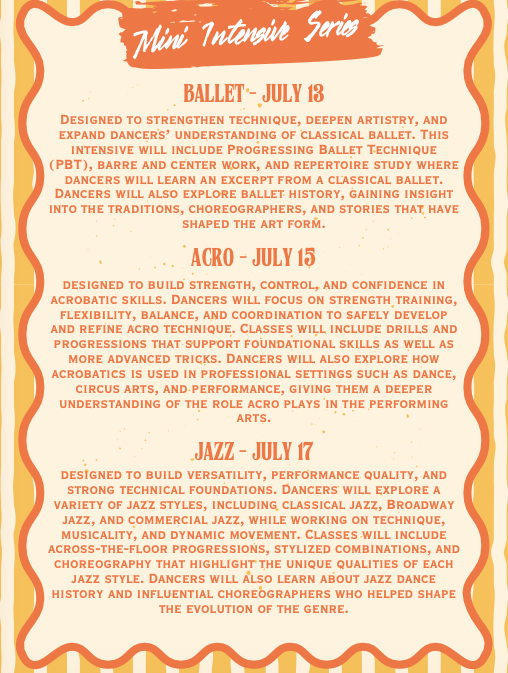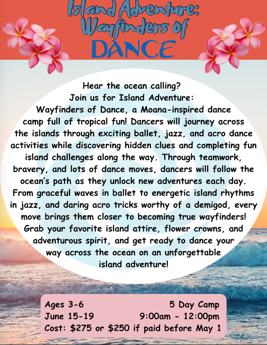 Wayfinders of Dance, a Monana-inspired dance camp full of tropical fun! Dancers will journey across the islands through exciting ballet, jazz, and acro dance activities while discovering hidden clues and completing fun island challenges along the way. Through teamwork, bravery, and lots of dance moves, dancers will follow the ocean’s path as they unlock new adventures each day. From graceful waves in ballet to energetic island rhythms in jazz, and daring acro tricks worthy of a demigod, every move brings them closer to becoming true wayfinders! Grab your favorite island attire, flower crowns, and adventurous spirit, and get ready to dance your way across the ocean on an unforgettable island adventure!